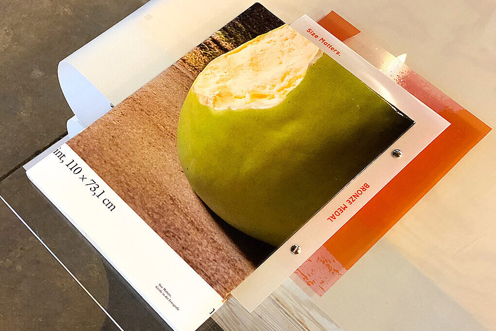 »Size Matters« nähert sich einer ausschlaggebenden Frage in der Fotografie gestalterisch: Welche Bedeutungsverschiebungen entstehen durch die Veränderung von Maßstäben und Ausschnitten? Simpel, aber genauso außergewöhnlich antwortet der Ausstellungskatalog auf dieses inhärente Thema mit der Übersetzung im Maßstab 1:1. Visuell wird sofort auf den ersten Buchseiten deutlich, dass fotografische Abbildungen im Bewusstsein wahrgenommen werden müssen, dass etwas nicht gezeigt wird. Die Gestaltung des Schriftbildes nimmt diese Analyse der gewohnten Darstellung im Medium Buch auch konzeptionell auf – übergroße Bildunterschriften in traditioneller eleganter Kursivschrift begleiten die teilweise extremen Ausschnitte der ausgestellten Fotografien. Weiterhin verweisen das Format des Buches, der Hochglanz-Schutzumschlag sowie die Papierart auf klassische Fotopublikationen der 1990er Jahre. In diesen subtilen Verweisen und bewussten, großen grafischen Gesten wird die Fotografie im zeitgenössischen Blick betrachtet.
